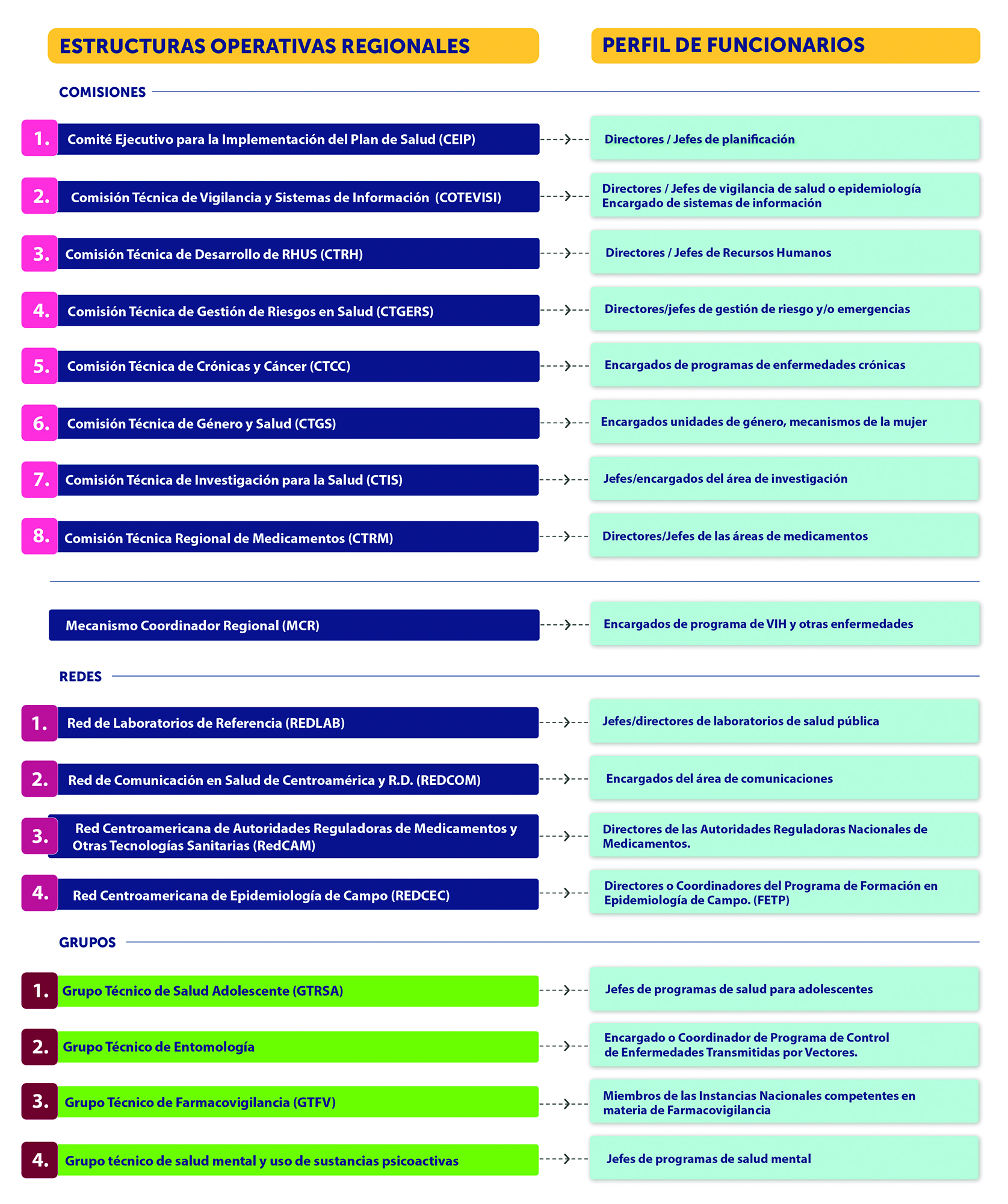 Por lo tanto, COMISCA constituye la instancia política del Sistema de la Integración Centroamericana, SICA, que tiene como propósito la rectoría del Sector Salud Regional; la identificación y priorización de los problemas regionales de salud, que son abordados conjuntamente mediante la Agenda y el Plan Centroamericano de Salud; la determinación de problemas de salud que debido a su multicausalidad y la trascendencia socioeconómica, requieren ser elevados al conocimiento de la Cumbre de Presidentes para la búsqueda de soluciones intersectoriales; el impulso de iniciativas regionales de salud que necesitan de la cooperación internacional gestionadas por medio) del SICA; así como, el seguimiento, la ejecución y la evaluación de los acuerdos y las resoluciones emanadas de las Cumbres en las que participen los Presidentes de Centroamérica.